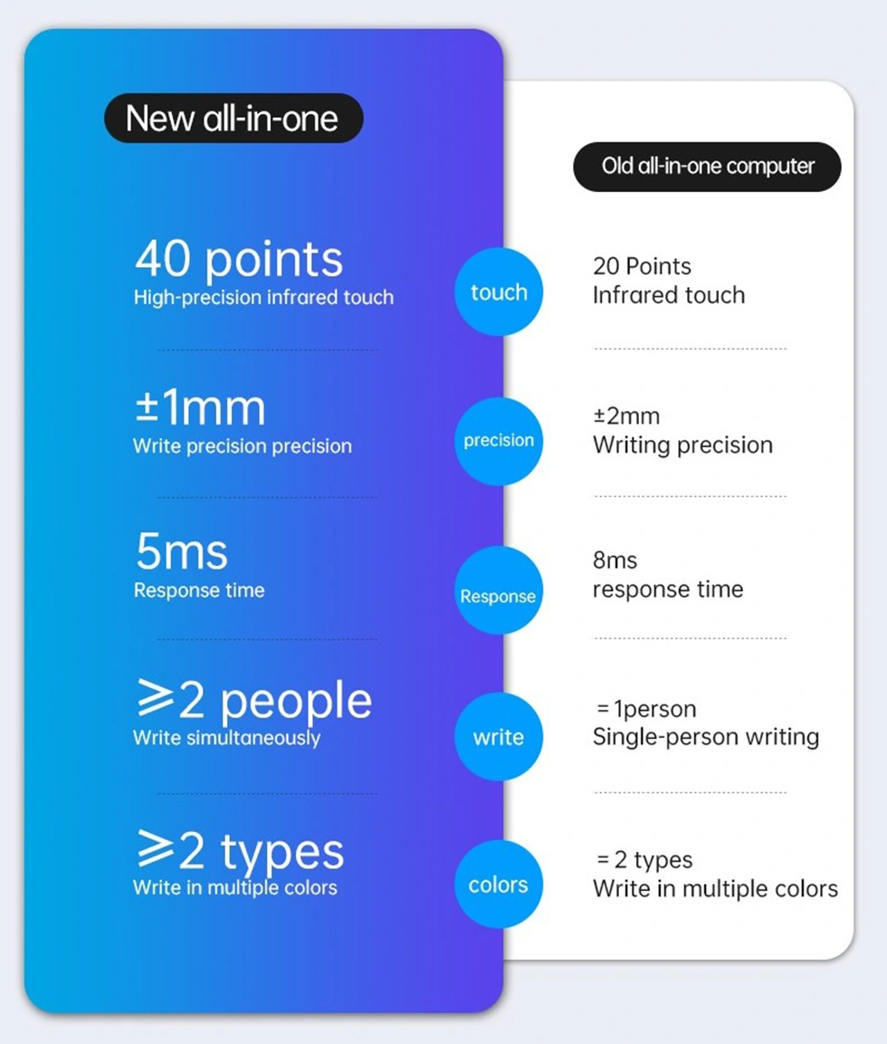 La tecnologia touch a infrarossi avanzata favorisce una collaborazione perfetta con un'interazione touch altamente reattiva e accurata. Supporta la collaborazione multiutente con 40 punti touch e controlli gestuali intuitivi per lo zoom e la navigazione. La tecnologia offre inoltre impostazioni della penna personalizzabili e un'area di lavoro espandibile per adattarsi alle diverse esigenze professionali.